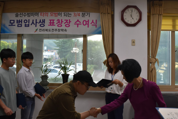 타의 모범이 되며, 입사생들에게 귀감이 되고 있는 3/4분기 모범상 표창이