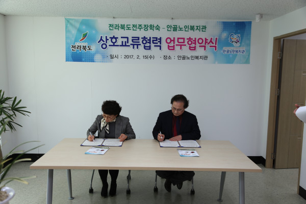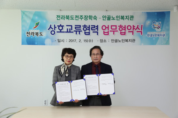 전라북도전주장학숙(원장 박종호)과 안골노인복지관(관장 이연숙)은 지난 15일 지역사회 노인복지 발전의 긴밀한 협력체계 구축을 위한 업무협약을 체결했다.