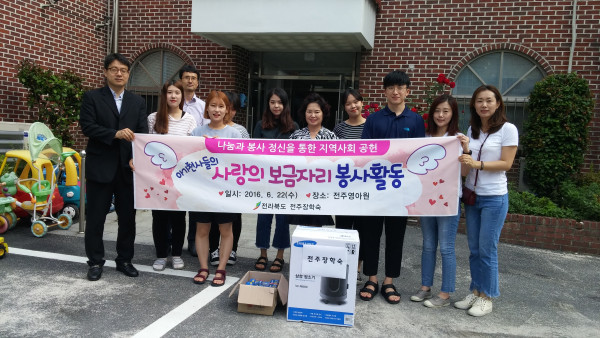 자원봉사활동(전주영아원) 페이지 정보 작성자 전주장학숙 댓글 0건 조회 2,176회 작성일 16-06-24 17:15 본문 지난 6월 22일 전주장학숙 입사생과 직원 등 전주영아원을 방문하여 시설봉사, 식당봉사, 돌봄봉사 등 몸소 실천하는 봉사활동을 하고 왔습니다. 목록 이전글 2/4분기 모범상 표창 다음글 헌혈증서 기부 댓글목록 댓글목록 등록된 댓글이 없습니다.