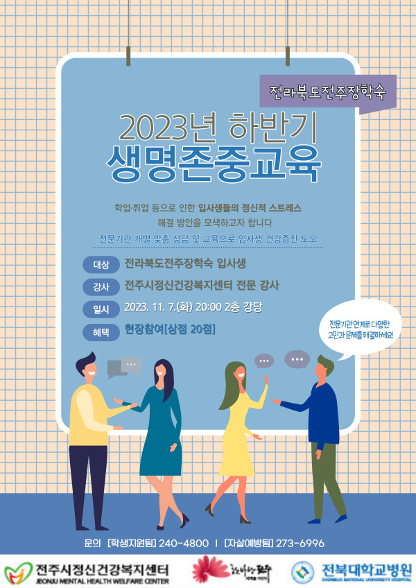 2023년 하반기 정신건강프로그램[전주시정신건강복지센터] 페이지 정보 작성자 관리자 댓글 0건 조회 817회 작성일 23-11-07 23:35 본문 2023년 하반기 정신건강프로그램 * 생명지킴이 양성교육[전주시정신건강복지센터] 목록 이전글 제13회 총동기회 총회 및 문화탐방 다음글 2023년 임용고시 및 국가고시 격려행사 댓글목록 댓글목록 등록된 댓글이 없습니다.