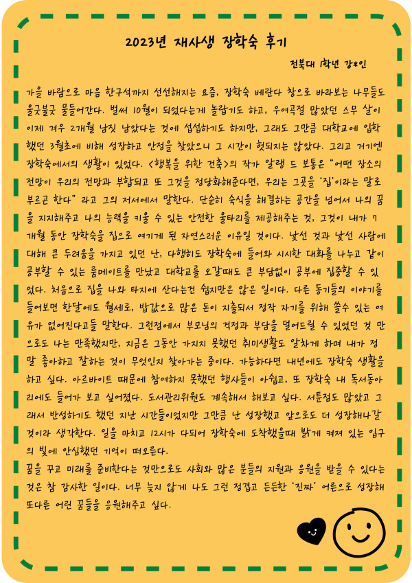 2023년 재사생 장학숙 생활 후기 페이지 정보 작성자 관리자 댓글 0건 조회 547회 작성일 24-11-26 15:42 본문 2023년 재사생 장학숙 생활 후기♥ 목록 이전글 2023년 재사생 장학숙 생활 후기 댓글목록 댓글목록 등록된 댓글이 없습니다.