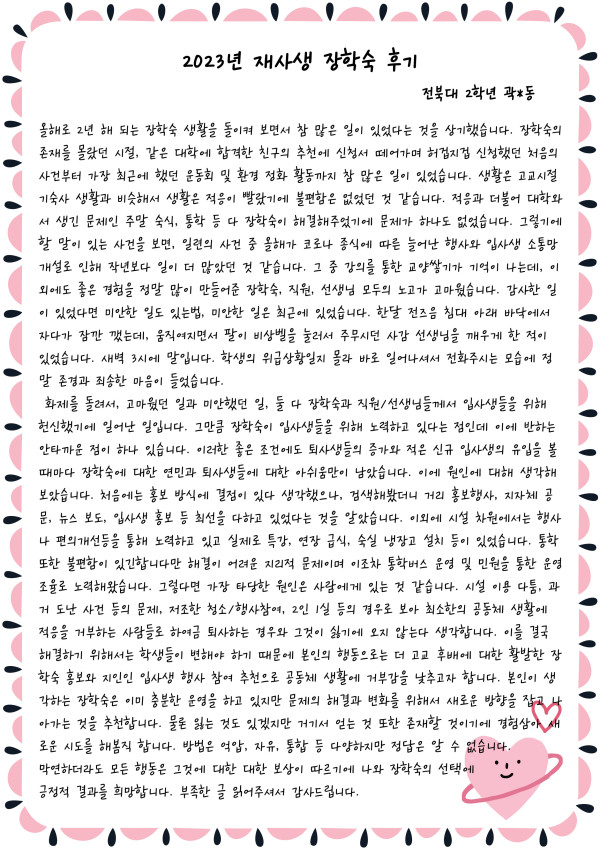 2023년 재사생 장학숙 생활 후기 페이지 정보 작성자 관리자 댓글 0건 조회 594회 작성일 24-11-26 15:44 본문 2023년 재사생 장학숙 생활 후기♥ 목록 이전글 2023년 재사생 장학숙 생활 후기 다음글 2023년 재사생 장학숙 생활 후기 댓글목록 댓글목록 등록된 댓글이 없습니다.