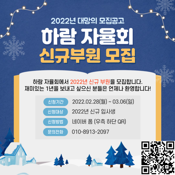 저희 하람 자율회에서 2022년도 신규 입사생을 대상으로 자율회 지원 신청을 받고 있습니다.
