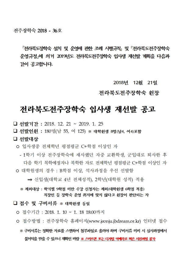 전라북도전주장학숙 입사생 재선발 공고(2019) 페이지 정보 작성자 전주장학숙 댓글 0건 조회 4,853회 작성일 18-12-21 09:05 본문 . 2019 입사생 재선발 원서접수 첨부파일 공고문_홈페이지-2019년 입사생 재선발.hwp (32.0K) 331회 다운로드 | DATE : 2018-12-21 09:05:28 목록 이전글 2019 전주장학숙 신규입사생 선발 공고 다음글 2019년 상반기 주부식(양곡류) 구매 재공고 댓글목록 댓글목록 등록된 댓글이 없습니다.