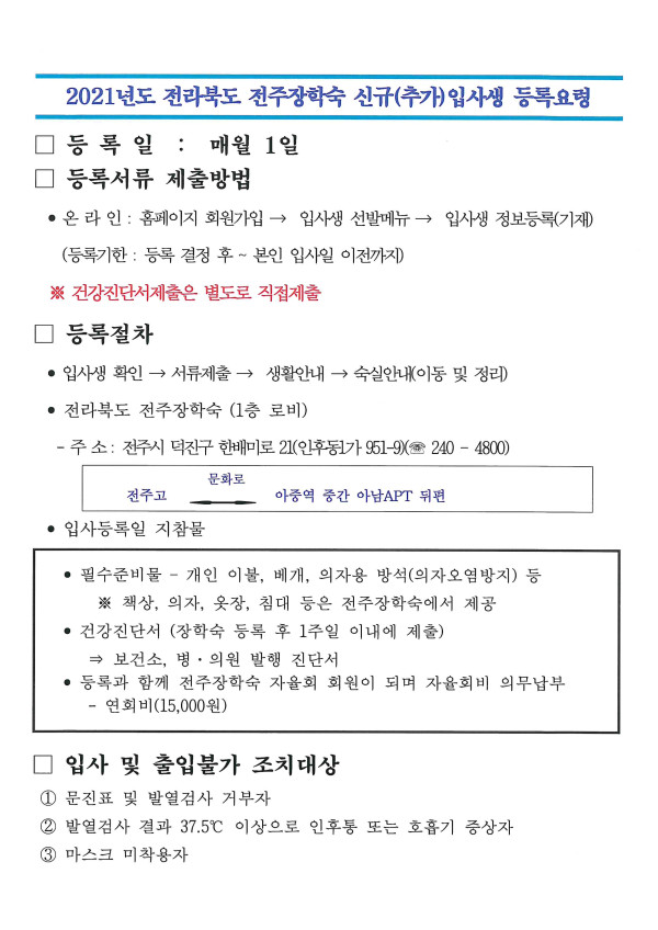 ※ 참고로 선발자 중 개인사정 및 학교기숙사 입사 등 사정에 의해 입사를 포기하는 경우에는(연락처 063-240-4800) 신속히 연락을 주셔야 차순위자들에게 도움이 되기 때문에 바로 연락 바랍니다.