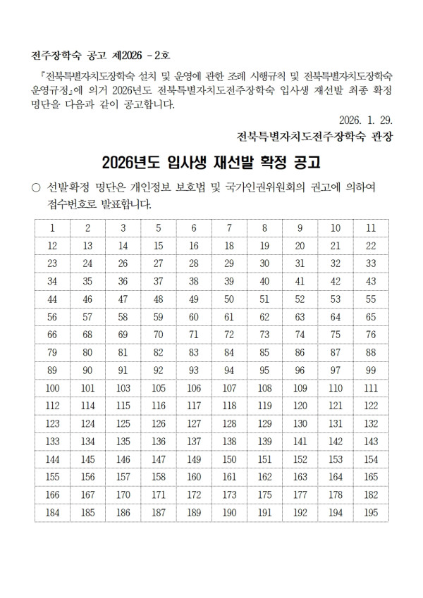 [2026-001] 2026년 입사생 재선발 확정 공고 페이지 정보 작성자 관리자 댓글 0건 조회 560회 작성일 26-01-29 10:20 본문 2026년도 입사생 재선발 확정 명단 입니다. 접수번호로 확인 바랍니다. 목록 이전글 2026년 전주장학숙 입사생 신규 선발 합격자 공고 다음글 2026년도 입사생 재선발 공고 댓글목록 댓글목록 등록된 댓글이 없습니다.