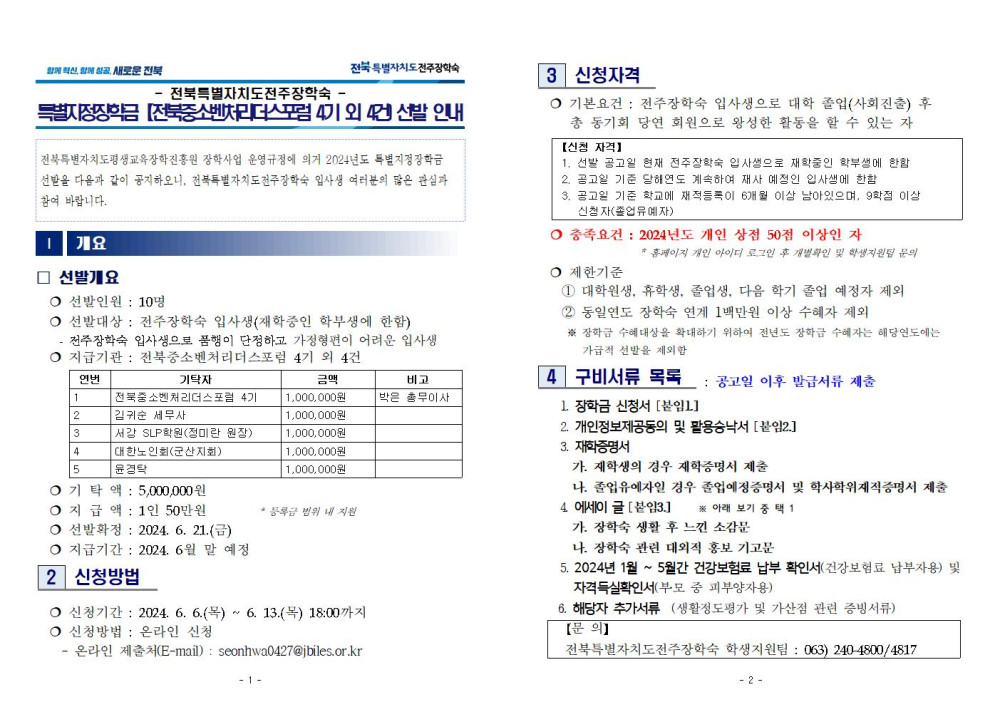2024년 특별지정장학금(전북중소벤처리더스포럼 4기 외 4건) 선발안내