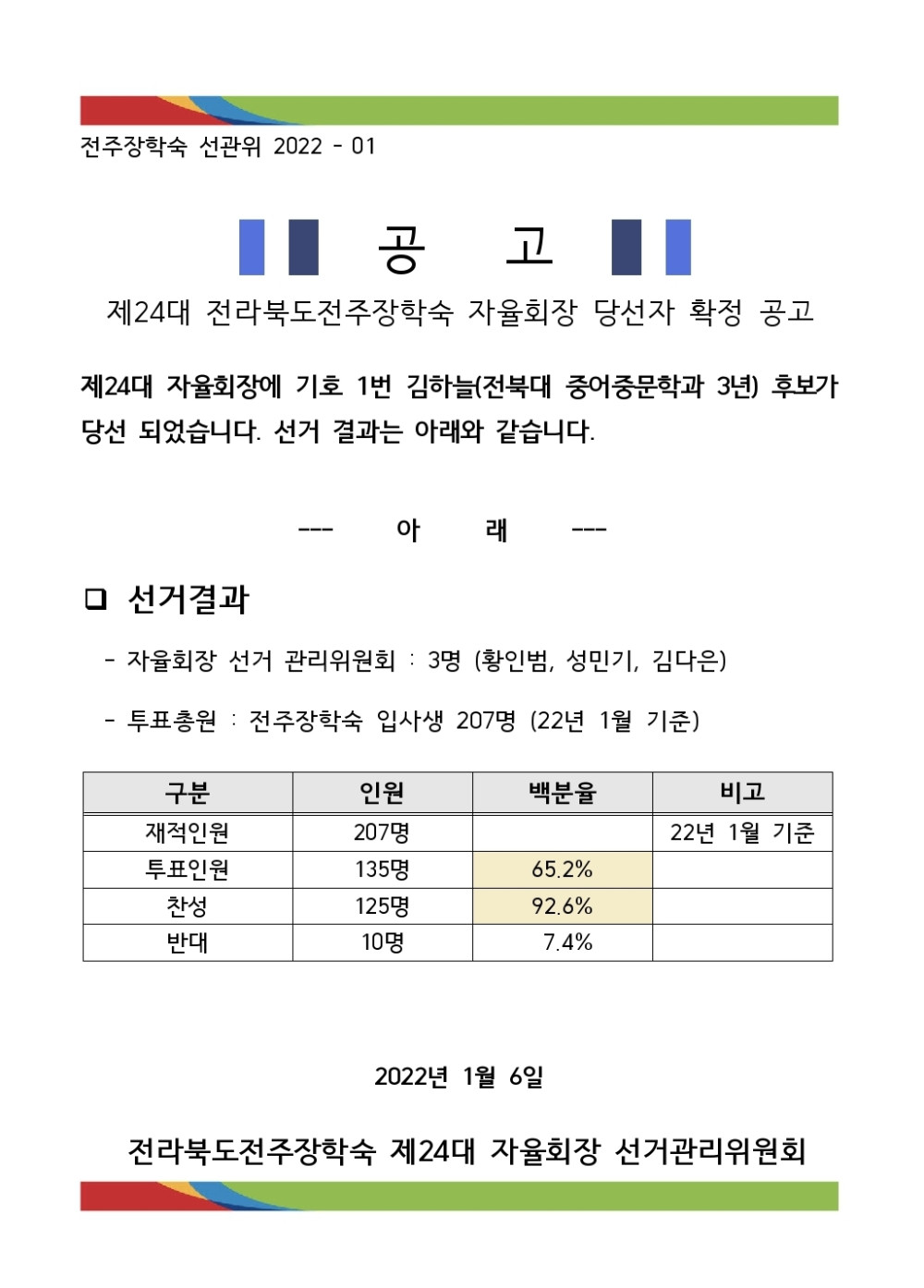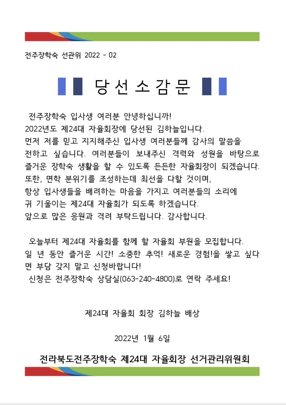 제24대 자율회장 확정 공고 / 당선 소감문 페이지 정보 작성자 학생지원팀정선영 댓글 0건 조회 4,536회 작성일 22-01-06 00:50 본문 제24대 자율회장 확정 공고 / 당선 소감문 목록 이전글 설 명절 임시휴관 알림 다음글 제24대 자율회장 선거(투표) 참여 안내 댓글목록 댓글목록 등록된 댓글이 없습니다.
