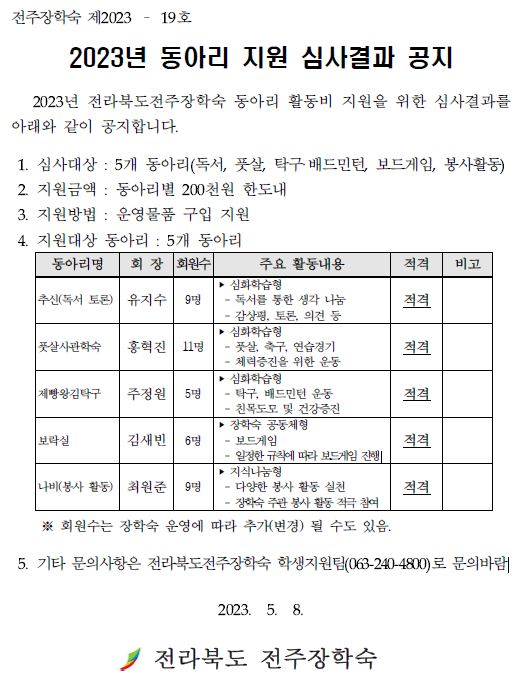 2023년 동아리 심사 결과 공지 페이지 정보 작성자 관리자 댓글 0건 조회 3,700회 작성일 23-05-09 00:01 본문 목록 이전글 2023년 전주장학숙 입사생 성년의 날 격려행사 공지 다음글 전주장학숙 사진 공모전 행사 안내 댓글목록 댓글목록 등록된 댓글이 없습니다.