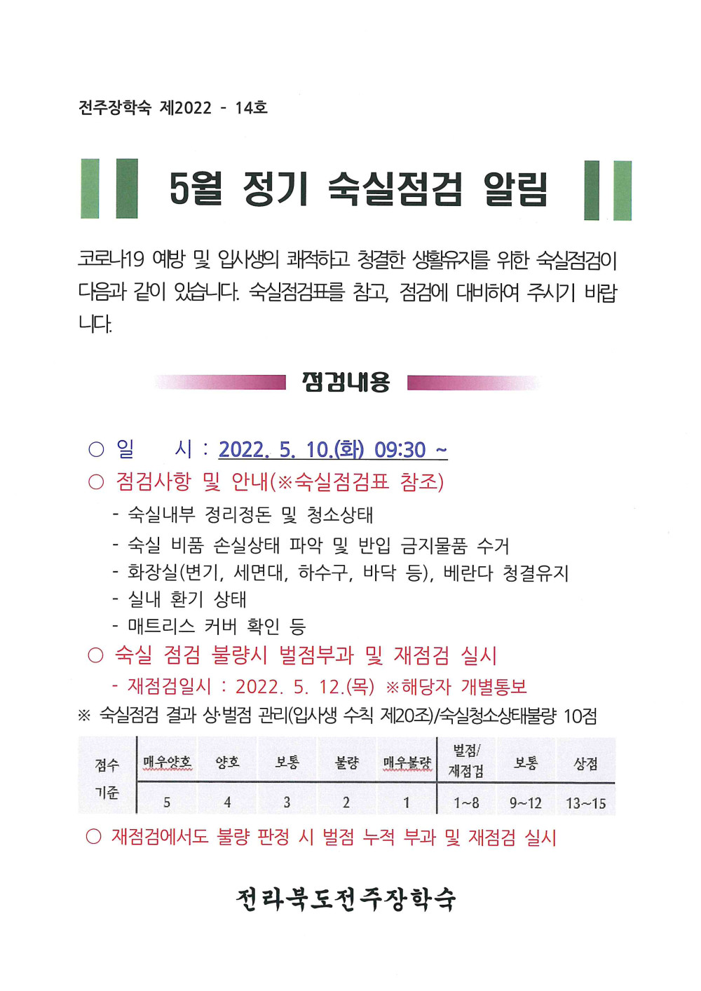 5월 정기 숙실점검 안내 페이지 정보 작성자 관리자 댓글 0건 조회 4,507회 작성일 22-05-03 09:12 본문 . 목록 이전글 소방시설물 안전점검안내 다음글 독서실 거리두기 해제 및 독서실 사용 안내 댓글목록 댓글목록 등록된 댓글이 없습니다.