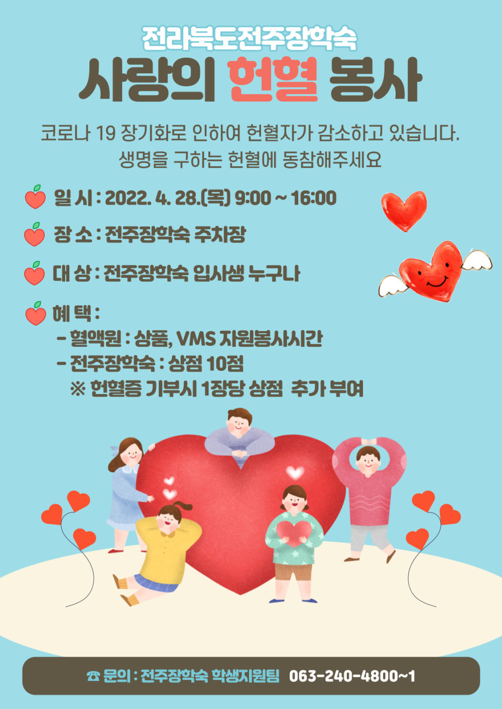 4월 28일 목요일 전주장학숙 주차장에서 헌혈행사가 진행 될 예정이오니