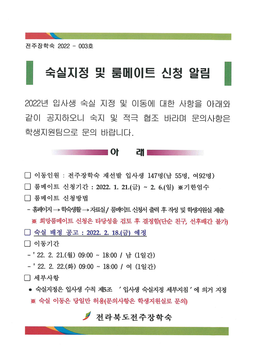 2022년 재선발 입사생 숙실지정 및 룸메이트 신청 페이지 정보 작성자 학생지원팀 댓글 0건 조회 4,968회 작성일 22-01-22 08:30 본문 첨부파일 숙실지정 세부지침.hwp (14.0K) 116회 다운로드 | DATE : 2022-01-22 08:30:36 룸메이트신청서.hwp (128.0K) 113회 다운로드 | DATE : 2022-01-22 08:30:36 목록 이전글 북카페 신규도서 비치 알림 다음글 물탱크 청소안내 댓글목록 댓글목록 등록된 댓글이 없습니다.