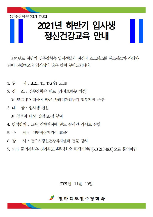 2021년 하반기 입사생 정신건강교육 안내