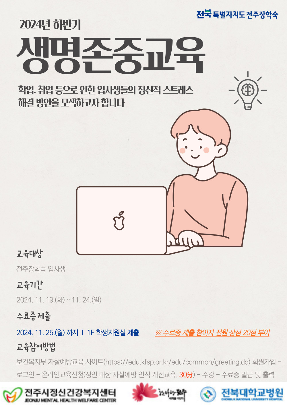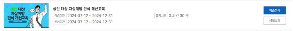 2024년 하반기 정신건강교육 안내[전주시정신건강복지센터] 페이지 정보 작성자 관리자 댓글 0건 조회 4,591회 작성일 24-11-18 17:34 본문 2024년 하반기 정신건강교육 안내[전주시정신건강복지센터]자세한사항은 첨부파일을 확인바랍니다. 온라인신청 주소 : 자살예방교육 목록 이전글 연탄나눔 봉사활동 실시 다음글 2024년도 전주장학숙 홍보 영상(숏폼, 브이로그) 공모전_특별지정장학금 댓글목록 댓글목록 등록된 댓글이 없습니다.