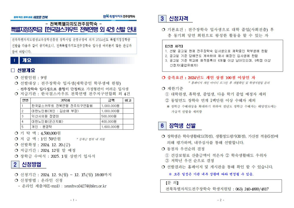 2024년 하반기 특별지정장학금(한국걸스카우트 전북연맹 외 4건) 선발안내