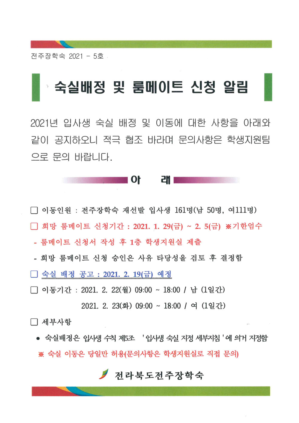 숙실배정 및 룸메이트 신청 알림 페이지 정보 작성자 학생지원팀 댓글 0건 조회 5,126회 작성일 21-01-29 18:39 본문 숙실배정 및 룸메이트 신청 알림 첨부파일 03.룸메이트신청서.hwp (84.0K) 183회 다운로드 | DATE : 2021-01-29 18:39:14 목록 이전글 명절 임시휴관 안내 다음글 2021년도 재선발 최종 확정자 공고 댓글목록 댓글목록 등록된 댓글이 없습니다.