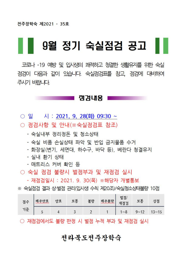 9월 정기 숙실점검 안내 페이지 정보 작성자 학생지원팀 댓글 0건 조회 3,834회 작성일 21-09-13 09:55 본문 목록 이전글 전북도, 사회적 거리두기 현 단계 2주 연장(10.4~10.17) 다음글 추석명절 임시휴관 공고 댓글목록 댓글목록 등록된 댓글이 없습니다.