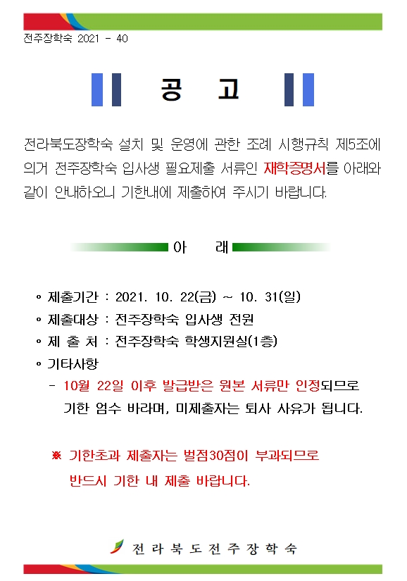 2021년도 하반기 재학증명서 제출 알림 페이지 정보 작성자 학생지원팀 댓글 0건 조회 3,779회 작성일 21-10-22 11:19 본문 입사생 여러분께서는 공지 내용을 정확히 숙지한 뒤 기간내에 제출하여 주시기 바랍니다. 목록 이전글 전북도, 단계적 일상 회복을 위한 거리두기 개편안 본격 시행 다음글 전주장학숙 입사생 헌혈행사 안내 댓글목록 댓글목록 등록된 댓글이 없습니다.