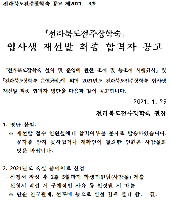 2021년도 재선발 최종 확정자 공고 페이지 정보 작성자 학생지원팀 댓글 0건 조회 4,190회 작성일 21-01-29 18:21 본문 2021년도 재선발 최종 확정자 공고 첨부파일 2021-재선발-합격자 명단.xlsx (17.5K) 289회 다운로드 | DATE : 2021-01-29 18:21:45 목록 이전글 숙실배정 및 룸메이트 신청 알림 다음글 사회적거리두기 2단계 연장 안내(2021. 1. 18 0시 ~ 2021. 1. 31 24시까지) 댓글목록 댓글목록 등록된 댓글이 없습니다.