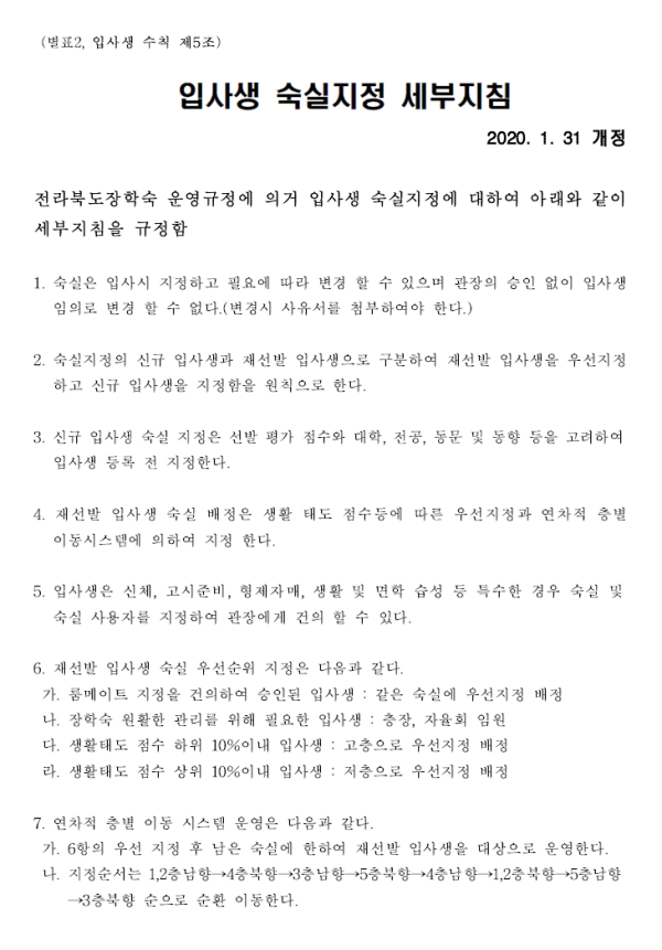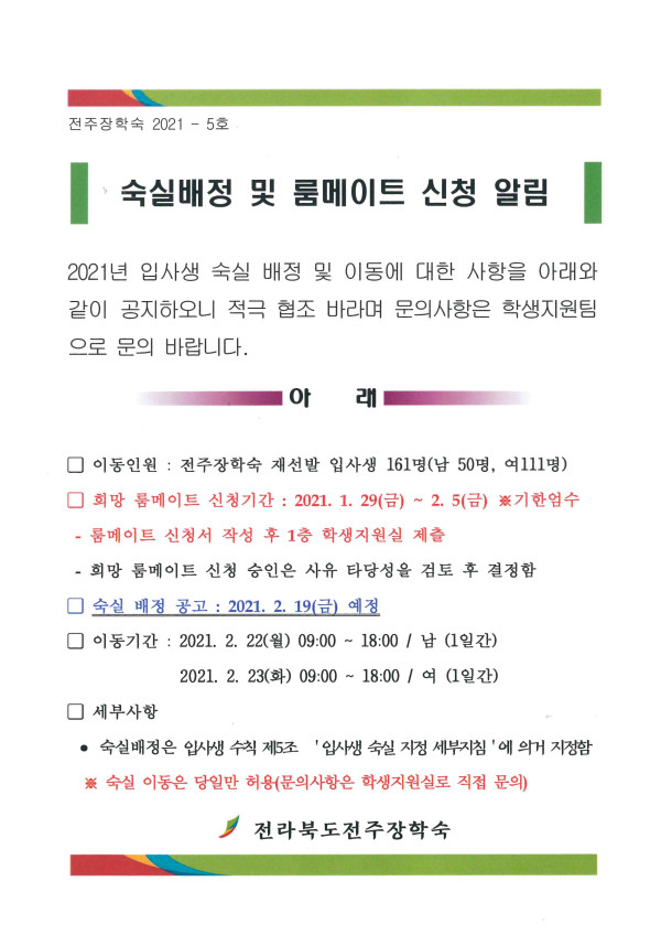 숙실배정 및 룸메이트 신청 알림 페이지 정보 작성자 학생지원팀 댓글 0건 조회 4,369회 작성일 21-01-29 18:39 본문 숙실배정 및 룸메이트 신청 알림 첨부파일 03.룸메이트신청서.hwp (84.0K) 152회 다운로드 | DATE : 2021-01-29 18:39:14 목록 이전글 명절 임시휴관 안내 다음글 2021년도 재선발 최종 확정자 공고 댓글목록 댓글목록 등록된 댓글이 없습니다.