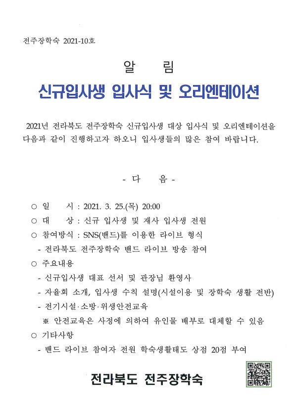 2021년 신규입사생 입사식 및 오리엔테이션 페이지 정보 작성자 학생지원팀 댓글 0건 조회 3,840회 작성일 21-03-12 09:40 본문 목록 이전글 2021년 동아리 등록 및 지원 공지 다음글 2021년 3월 정기 숙실 점검 안내 댓글목록 댓글목록 등록된 댓글이 없습니다.