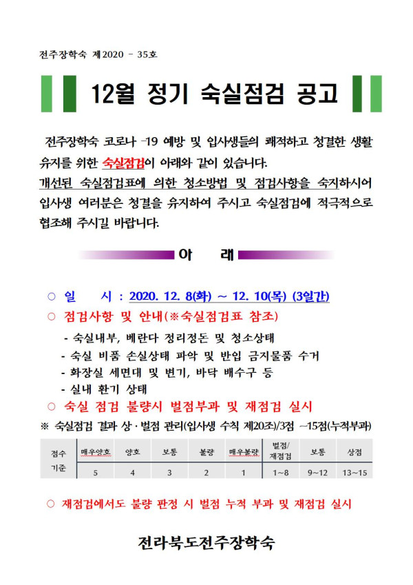 12월 정기 숙실 점검 및 안내 페이지 정보 작성자 전주장학숙 댓글 0건 조회 3,905회 작성일 20-12-01 09:04 본문 목록 이전글 제23대 선관위 위촉 안내 다음글 2020 하반기 "인문학으로 설계하는 우리의 미래" 강좌 잠정연기 안내 댓글목록 댓글목록 등록된 댓글이 없습니다.