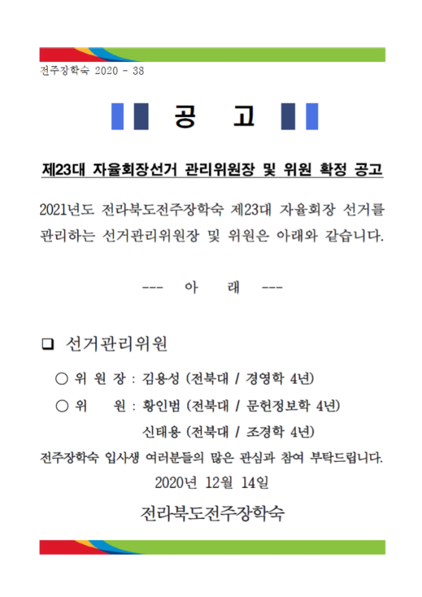 제23대 선관위 위촉 안내 페이지 정보 작성자 전주장학숙 댓글 0건 조회 3,828회 작성일 20-12-14 11:06 본문 제23대 선관위 위촉 안내 목록 이전글 제23대 자율회장 모집 공고 다음글 12월 정기 숙실 점검 및 안내 댓글목록 댓글목록 등록된 댓글이 없습니다.