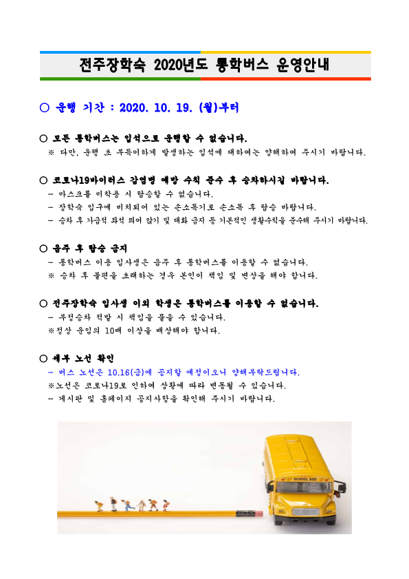 전주장학숙 통학버스 이용 안내문 페이지 정보 작성자 학생지원팀 댓글 0건 조회 3,861회 작성일 20-10-15 23:40 본문 - 버스 노선표는 10.16(금) 내일 공지할 예정이오니 양해부탁드립니다. 목록 이전글 ◎코로나19 극복기원, 생활수기 쓰기 이벤트◎ 다음글 사회적 거리두기 1단계 완화 행정명령 공고 댓글목록 댓글목록 등록된 댓글이 없습니다.