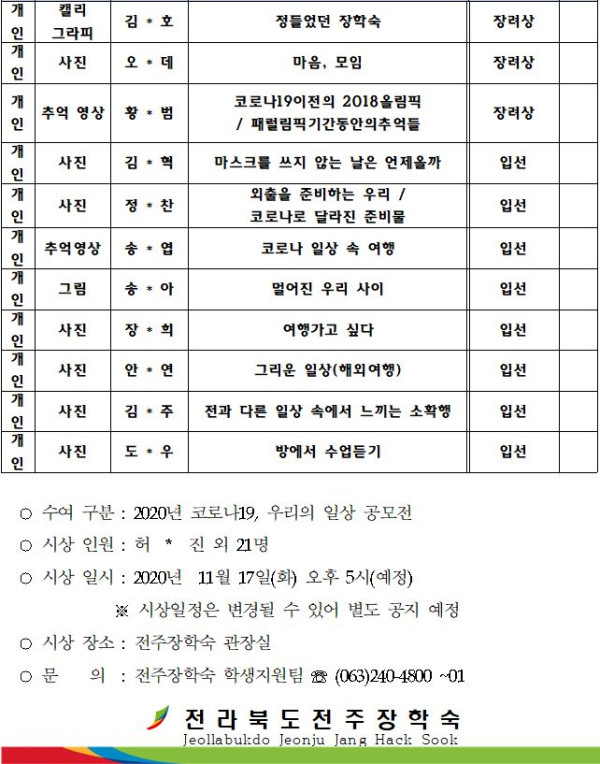 - 우리의 일상 공모전_당선작_선정공고.hwp (288.0K) 60회 다운로드 | DATE : 2020-11-11 11:35:37