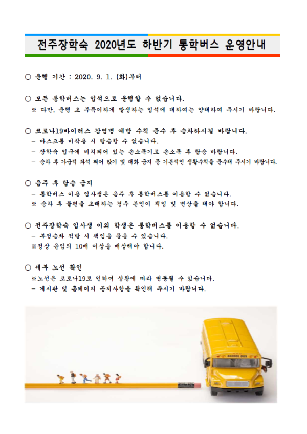 전주장학숙 통학버스 이용 안내문 페이지 정보 작성자 학생지원팀 댓글 0건 조회 3,909회 작성일 20-08-30 18:42 본문 전주장학숙 통학버스 이용 안내문 목록 이전글 9월 정기 숙실 점검 및 안내 다음글 2020년 하반기 통학버스 운행 시간표(9.1 ~9.4) 댓글목록 댓글목록 등록된 댓글이 없습니다.