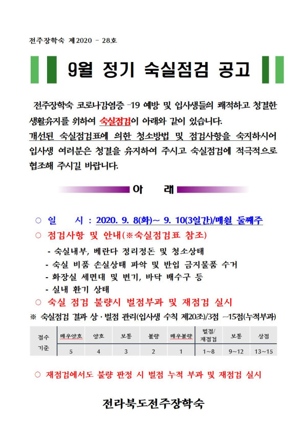 9월 정기 숙실 점검 및 안내 페이지 정보 작성자 학생지원팀 댓글 0건 조회 3,802회 작성일 20-09-03 07:50 본문 목록 이전글 2020년 하반기 통학버스 운행 시간표(9.7 ~9.11) 다음글 전주장학숙 통학버스 이용 안내문 댓글목록 댓글목록 등록된 댓글이 없습니다.