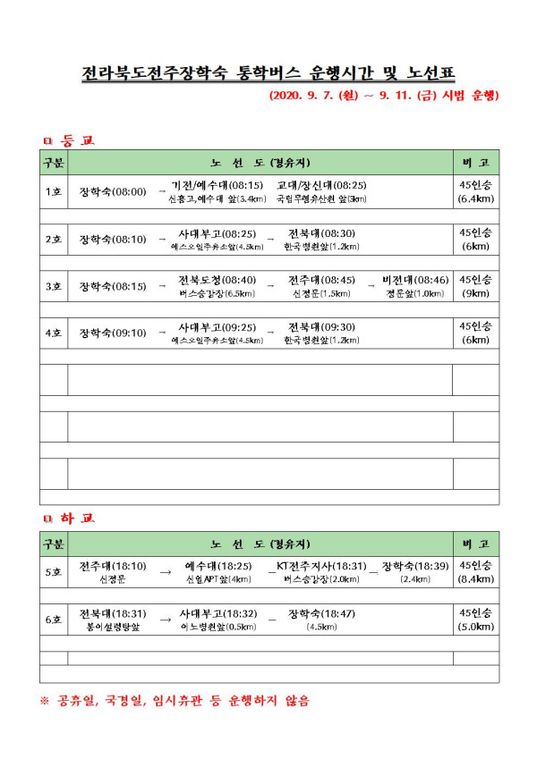 2020년 하반기 통학버스 운행 시간표(9.7 ~9.11) 페이지 정보 작성자 전주장학숙 댓글 0건 조회 3,924회 작성일 20-09-05 11:21 본문 . 목록 이전글 전라북도, 사회적거리두기 2단계 연장 조치 발표 다음글 9월 정기 숙실 점검 및 안내 댓글목록 댓글목록 등록된 댓글이 없습니다.