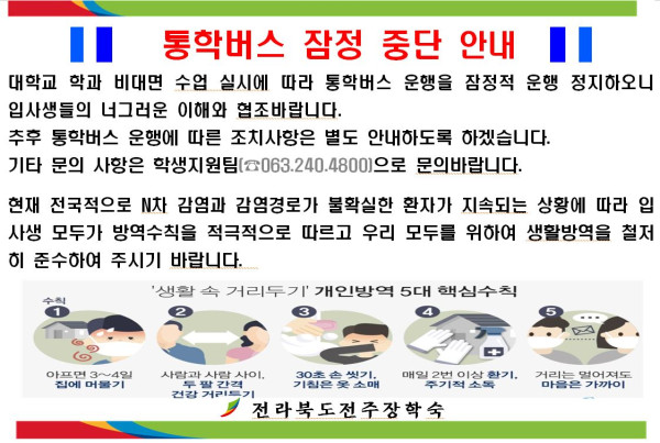 2020년 하반기 통학버스 운행 잠정중단 안내 페이지 정보 작성자 학생지원팀 댓글 0건 조회 3,777회 작성일 20-09-11 12:10 본문 목록 이전글 3/4분기 모범상 표창자 선정 계획 다음글 전라북도, 사회적거리두기 2단계 연장 조치 발표 댓글목록 댓글목록 등록된 댓글이 없습니다.