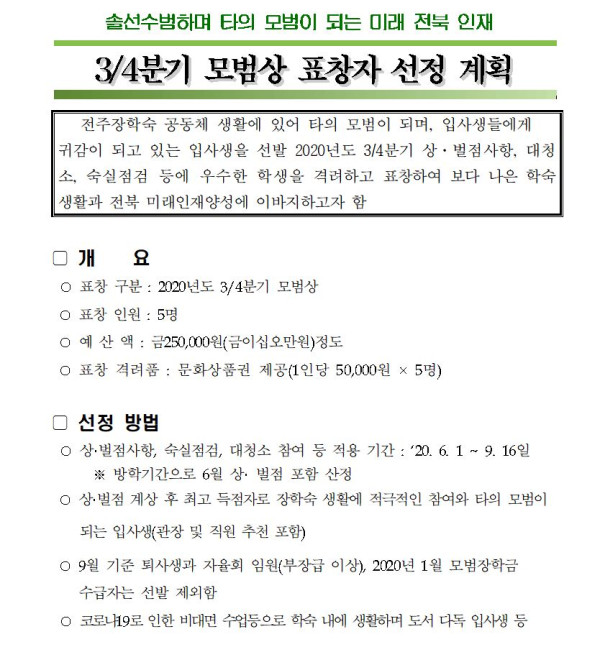 3/4분기 모범상 표창자 선정 계획 페이지 정보 작성자 학생지원팀 댓글 0건 조회 3,790회 작성일 20-09-16 21:02 본문 3/4분기 모범상 표창자 선정 계획 첨부파일 모범상 표창 선정 계획.hwp (80.0K) 56회 다운로드 | DATE : 2020-09-16 21:02:26 목록 이전글 사회적 거리두기 2단계 연장 다음글 2020년 하반기 통학버스 운행 잠정중단 안내 댓글목록 댓글목록 등록된 댓글이 없습니다.