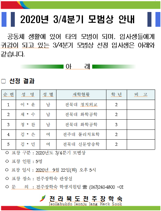 2020년 3분기 모범 입사생 선정 안내 페이지 정보 작성자 관리자 댓글 0건 조회 3,803회 작성일 20-09-22 21:14 본문 목록 이전글 추석 임시휴관 안내 [09.29(화) 17:00 ~ 10.04(일) 09:00] 다음글 사회적 거리두기 2단계 연장 댓글목록 댓글목록 등록된 댓글이 없습니다.