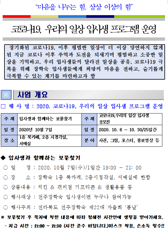 ◈ 입사생과 함께하는 보물찾기 참여 안내 페이지 정보 작성자 학생지원팀 댓글 0건 조회 3,760회 작성일 20-10-06 11:49 본문 . 목록 이전글 ◈ 코로나 19, 우리의 일상 입사생 공모전 참여 안내 [10/6(화) ~ 10/30(금)] 다음글 2020년도 하반기 재학증명서 제출 공고 댓글목록 댓글목록 등록된 댓글이 없습니다.