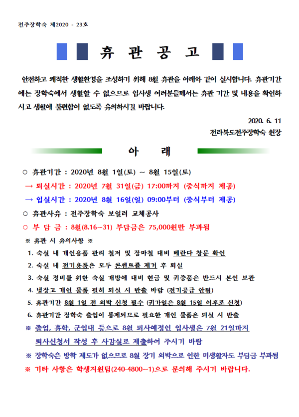 8월 휴관 공고 페이지 정보 작성자 전주장학숙 댓글 0건 조회 4,046회 작성일 20-06-11 15:51 본문 8월 휴관 공고 목록 이전글 코로나19 극복! 농촌봉사활동 참여자 모집 다음글 연장급식 중지 안내 댓글목록 댓글목록 등록된 댓글이 없습니다.