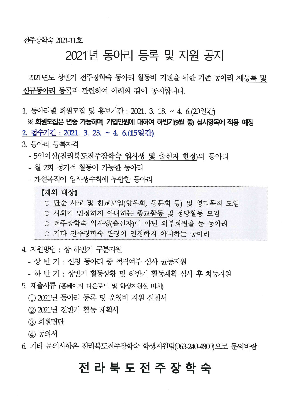 2021년 동아리 등록 및 지원 공지 페이지 정보 작성자 학생지원팀 댓글 0건 조회 4,567회 작성일 21-03-12 09:41 본문 첨부파일 3. 상반기 동아리 지원 서식.hwp (128.0K) 95회 다운로드 | DATE : 2021-03-12 17:27:43 목록 이전글 2021년 전주장학숙 "사랑의 헌혈" 봉사활동 다음글 2021년 신규입사생 입사식 및 오리엔테이션 댓글목록 댓글목록 등록된 댓글이 없습니다.