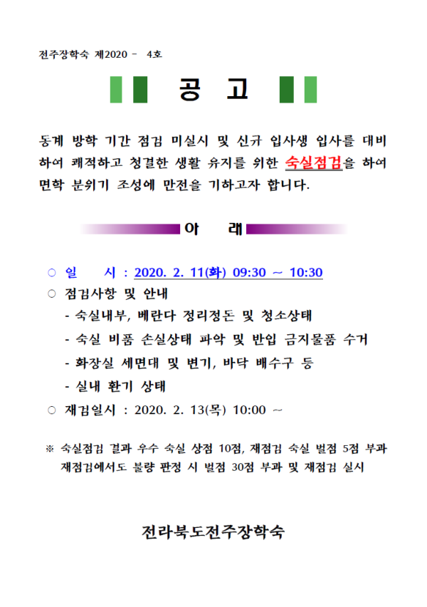 2월 정기 숙실 점검 페이지 정보 작성자 관리자 댓글 0건 조회 3,953회 작성일 20-02-03 17:59 본문 2월 정기 숙실 점검 목록 이전글 재선발 입사생 숙실배정 안내 다음글 2020 재선발 입사생 숙실 배정 및 이동안내 댓글목록 댓글목록 등록된 댓글이 없습니다.