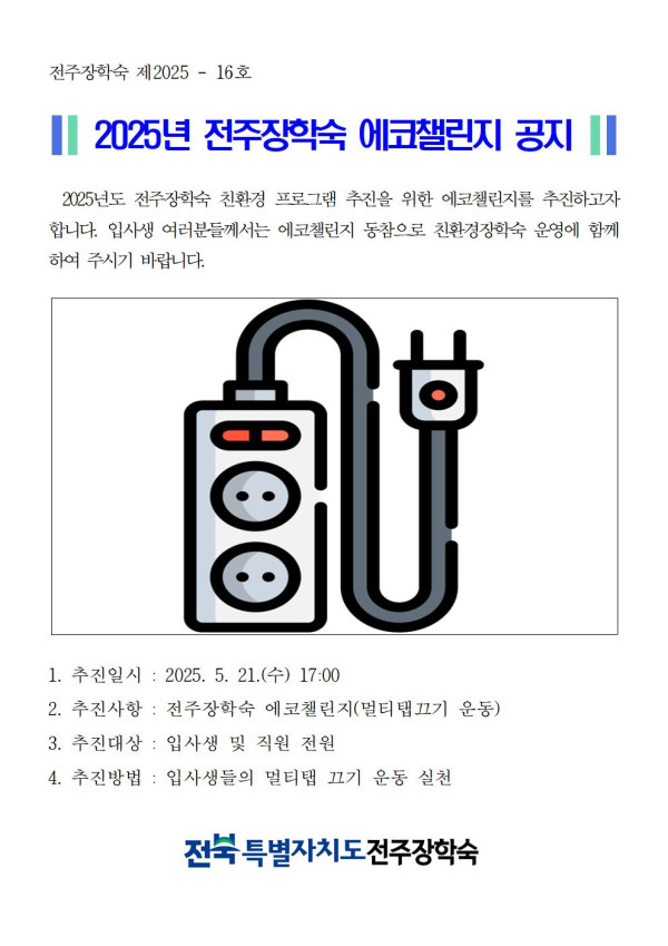 2025년 전주장학숙 에코챌린지 공지 페이지 정보 작성자 관리자 댓글 0건 조회 1,581회 작성일 25-05-20 17:07 본문 전주장학숙 친환경 프로그램으로 에코챌린지를 추진하고자 합니다. 목록 이전글 2025년 5월 숙실점검 알림 다음글 2025년 숙실 냉방 공급 안내 댓글목록 댓글목록 등록된 댓글이 없습니다.