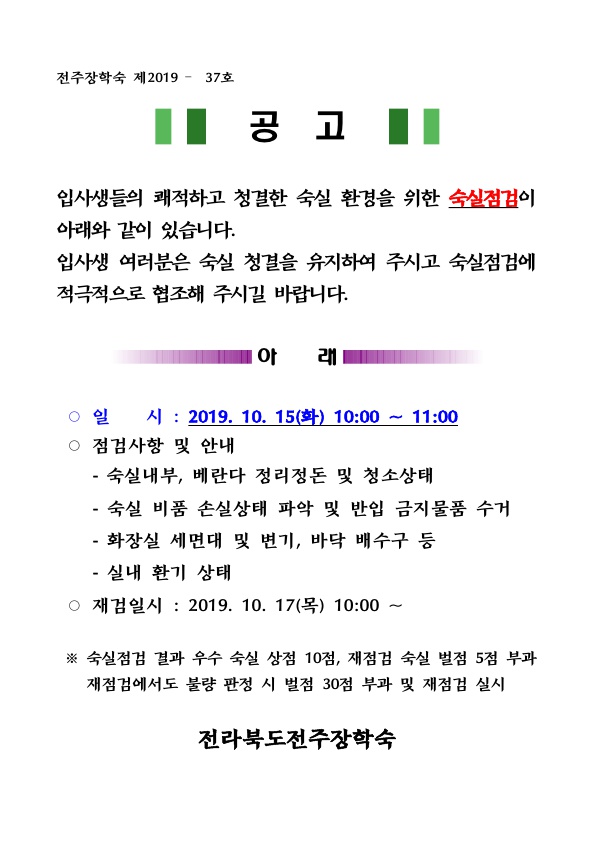 10월 정기 숙실점검 안내 페이지 정보 작성자 관리자 댓글 0건 조회 3,941회 작성일 19-10-03 09:12 본문 목록 이전글 화상벌레 발견 시 주의사항 알림 다음글 2019년도 하반기 재학증명서 제출 알림 댓글목록 댓글목록 등록된 댓글이 없습니다.