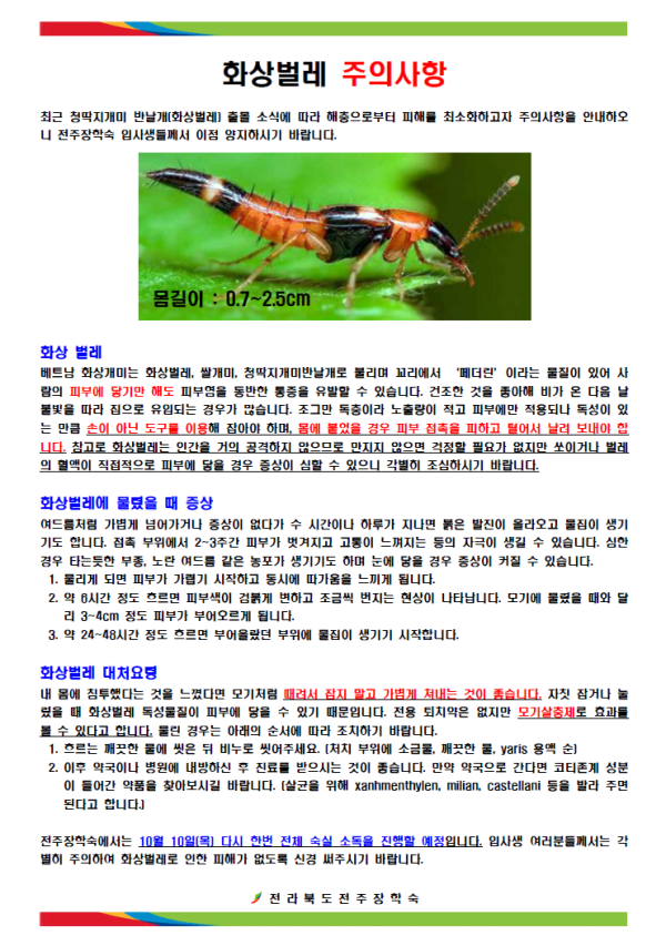 화상벌레 발견 시 주의사항 알림 페이지 정보 작성자 전주장학숙 댓글 0건 조회 3,948회 작성일 19-10-07 18:05 본문 화상벌레 발견 시 주의사항 알림 목록 이전글 하반기 특별 교양 ART 콘서트 관람 안내 다음글 10월 정기 숙실점검 안내 댓글목록 댓글목록 등록된 댓글이 없습니다.