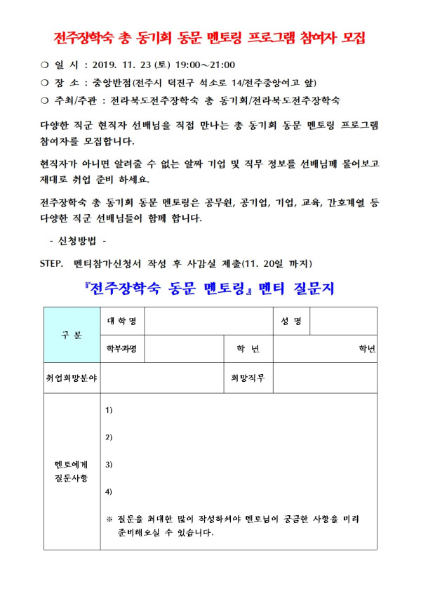전주장학숙 총 동기회 동문 멘토링 프로그램 참여자 모집 페이지 정보 작성자 관리자 댓글 0건 조회 3,833회 작성일 19-10-30 11:24 본문 . 첨부파일 총동기회-동문멘토링.hwp (16.0K) 52회 다운로드 | DATE : 2019-10-30 11:24:31 목록 이전글 11월 정기 숙실점검 안내 다음글 하반기 특별 교양 ART 콘서트 관람 안내 댓글목록 댓글목록 등록된 댓글이 없습니다.