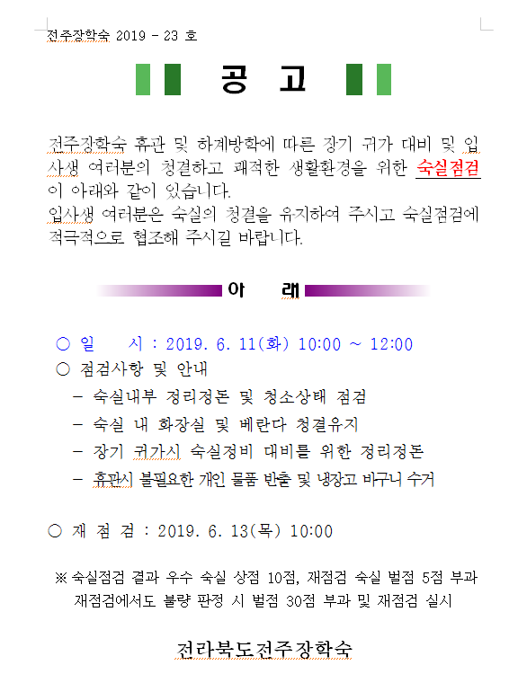 6월 입사생 숙실 정기 점검 안내 페이지 정보 작성자 관리자 댓글 0건 조회 4,058회 작성일 19-06-06 15:03 본문 . 목록 이전글 2019년 냉방 공급 일정 안내 다음글 전주장학숙 휴관 공고(7월) 댓글목록 댓글목록 등록된 댓글이 없습니다.