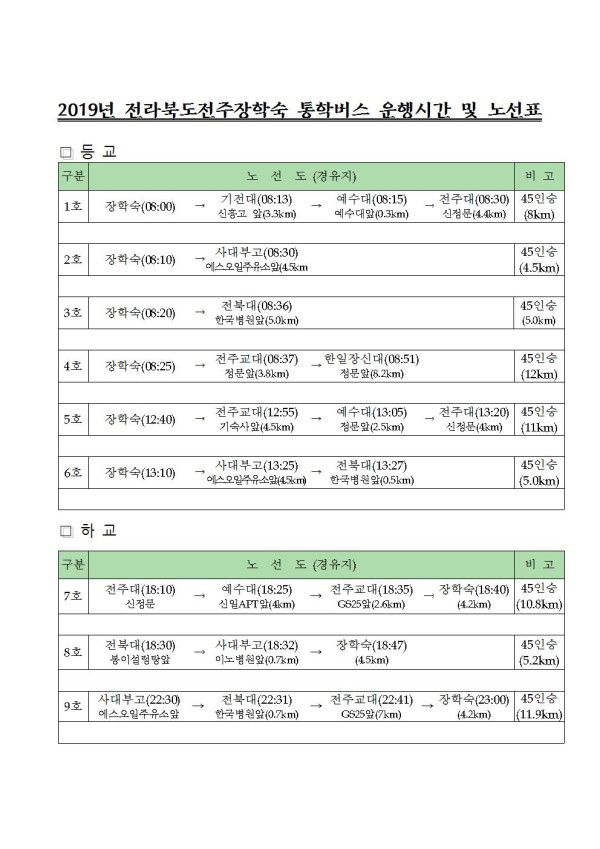 2019년 상반기 버스 노선표 페이지 정보 작성자 관리자 댓글 0건 조회 4,425회 작성일 19-02-28 09:00 본문 2019. 3. 4부터 운행합니다. 첨부파일 전주장학숙 노선 .hwp (16.5K) 94회 다운로드 | DATE : 2019-02-28 09:00:12 목록 이전글 2019년도 동아리 모집 안내 다음글 식사시간 변경안내 댓글목록 댓글목록 등록된 댓글이 없습니다.