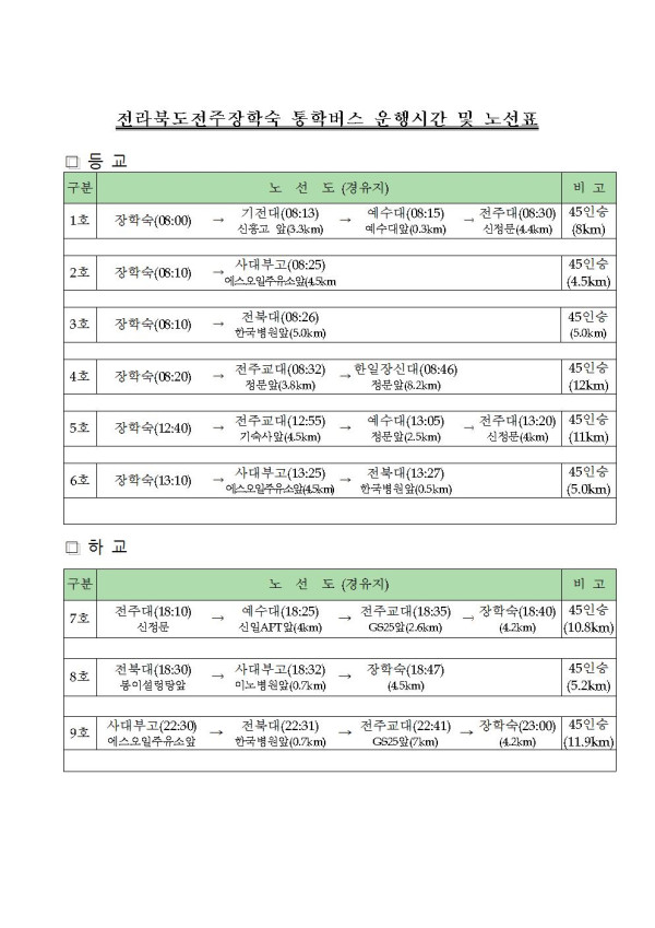 전북대 2대 동시출발 기존 08:20 -> 변경08:10 / 기존 08:10 -> 08:10