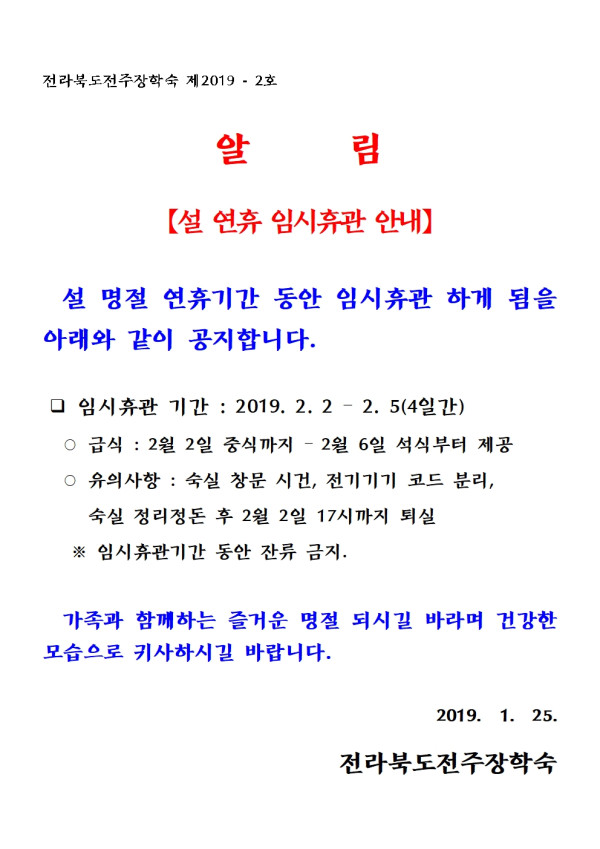 설 연휴 임시휴관 안내 페이지 정보 작성자 관리자 댓글 0건 조회 4,204회 작성일 19-01-25 08:53 본문 . 첨부파일 설 휴관 알림.hwp (13.5K) 57회 다운로드 | DATE : 2019-01-25 08:54:22 목록 이전글 2019 재선발 입사생 숙실 재배정 및 이동안내 다음글 식사시간 변경 안내 댓글목록 댓글목록 등록된 댓글이 없습니다.