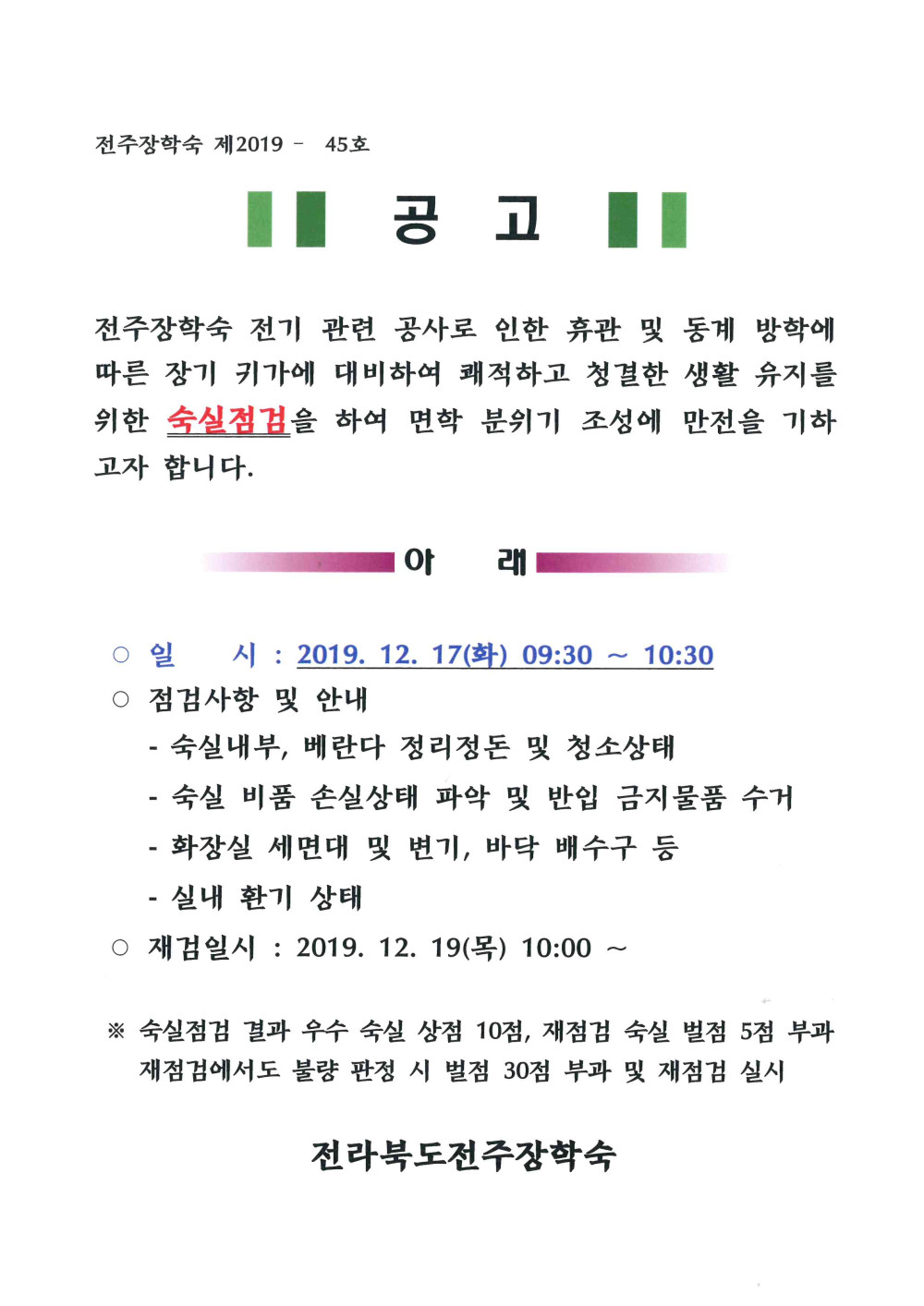 12월 정기 숙실 점검 안내 페이지 정보 작성자 관리자 댓글 0건 조회 4,681회 작성일 19-12-09 09:45 본문 목록 이전글 제22대 자율회장 확정 공고 / 당선 소감문 다음글 식사시간 변경안내 댓글목록 댓글목록 등록된 댓글이 없습니다.