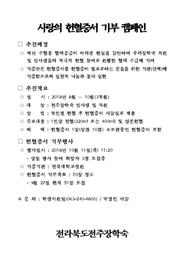 사랑의 헌혈증서 기부 캠페인 페이지 정보 작성자 관리자 댓글 0건 조회 4,073회 작성일 18-09-27 15:30 본문 . 목록 이전글 10월 숙실 및 수목 수독안내 다음글 숙실 에어컨 리모컨 건전지 분리 안내 댓글목록 댓글목록 등록된 댓글이 없습니다.
