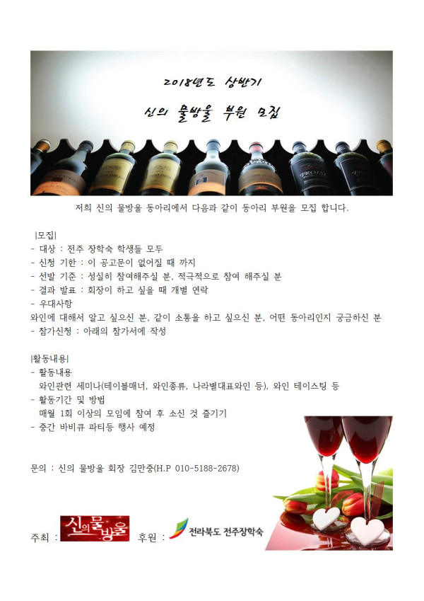 2018년도 동아리 회원 모집 페이지 정보 작성자 전주장학숙 댓글 0건 조회 4,519회 작성일 18-03-15 17:30 본문 2018년도 동아리 회원 모집 목록 이전글 고농도 미세먼지 대처 방안 다음글 건강진단서 제출 댓글목록 댓글목록 등록된 댓글이 없습니다.